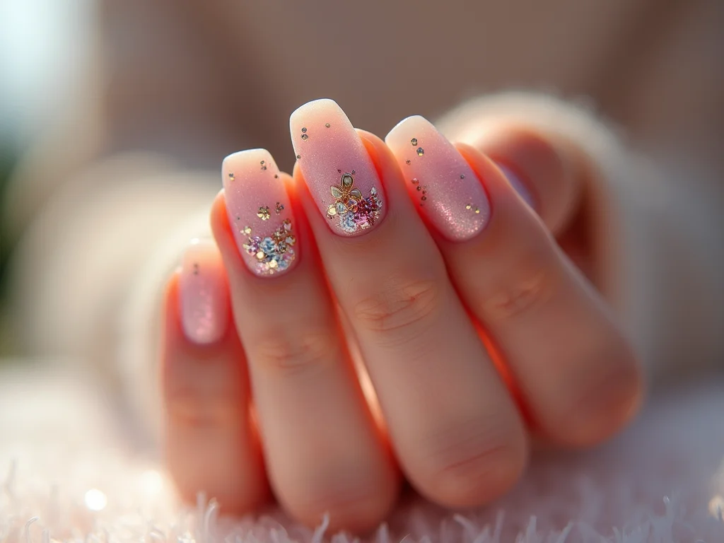 Detalhe de unha com banho de gel, exibindo uma unha encapsulada com glitter colorido em pedaços, com formato irregular e textura aparente.