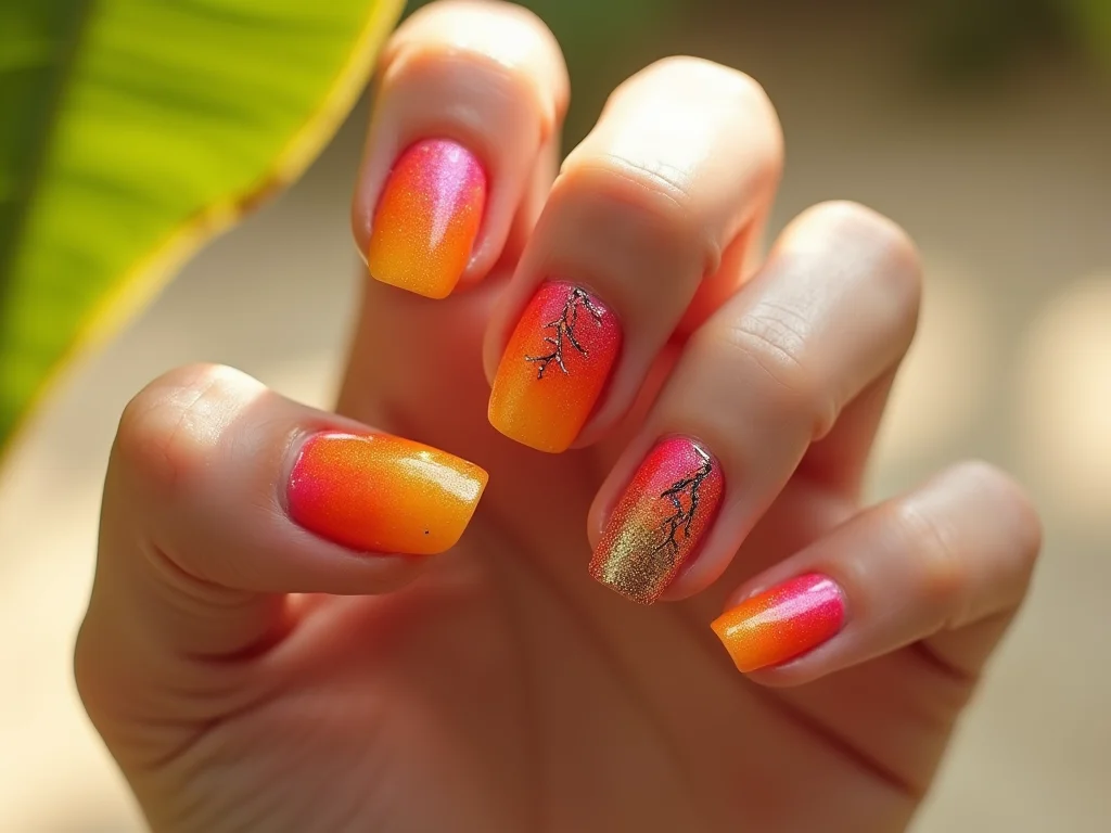 Manicure com tons de pôr do sol e esmalte cintilante.