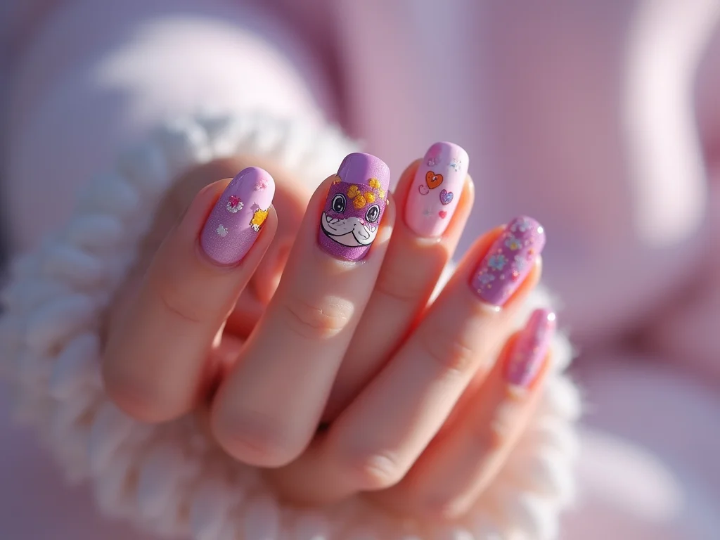 Manicure temática do grupo Bangtan Boys com personagens fofos.