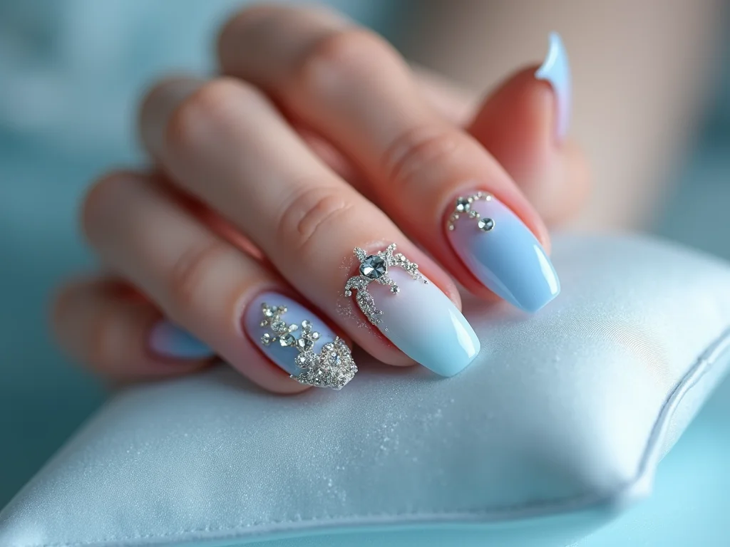 Vamos combinar, um toque de brilho pode levantar qualquer astral, né? E para a unha decorada Cinderela, essa opção é certeira. Pense em um esmalte azul clarinho, como o céu da meia-noite, e alguns pontinhos de luz com cristais ou paetês prateados em uma ou duas unhas. Fica delicado, charmoso e com aquele ar de conto de fadas que a gente adora.