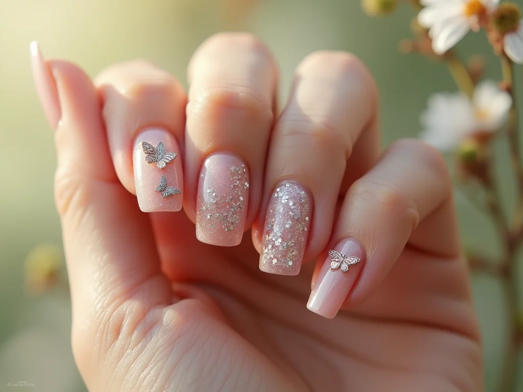 Borboletas em glitter: a magia da nail art com borboletas delicadas.