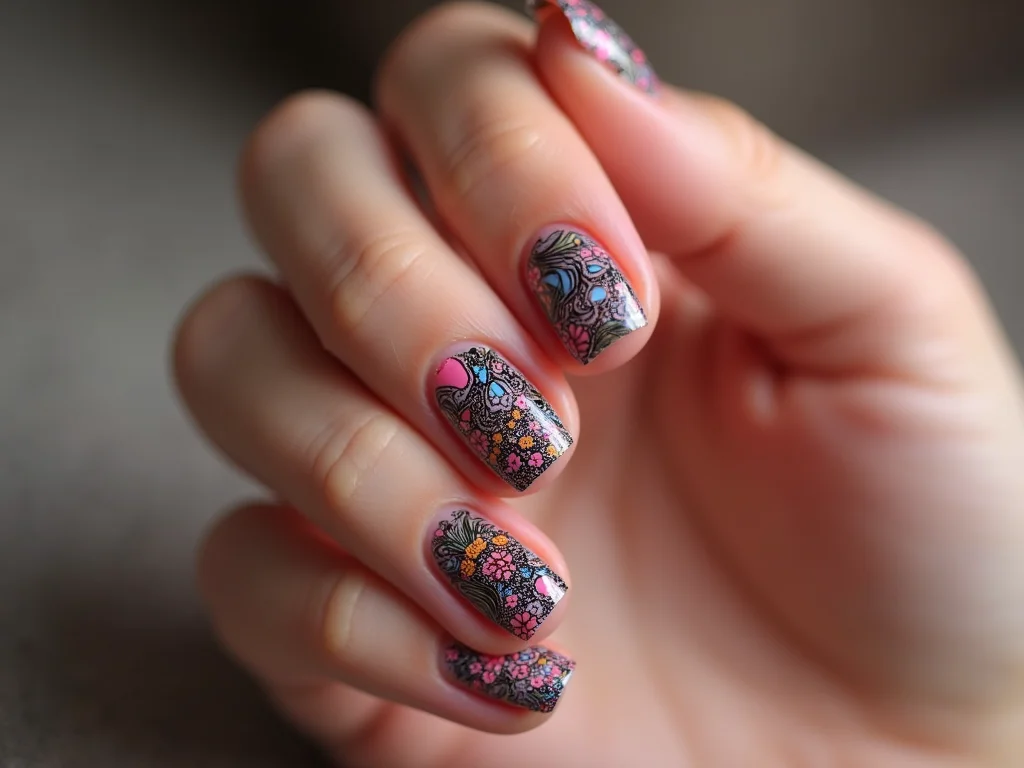 As opções são infinitas: desde florais delicados em tons pastéis até designs mais ousados com cores vibrantes. O importante é que a estampa escolhida complemente a cor base das outras unhas, criando uma harmonia visual. Essa técnica permite uma grande liberdade criativa, transformando suas unhas em verdadeiras telas de arte.