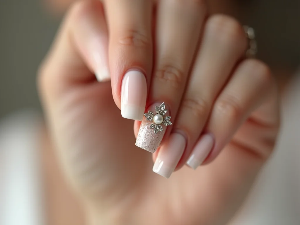 | Minimalista com Brilho | Strass pequeno e pérolas em tons claros | Nude elegante, branco |