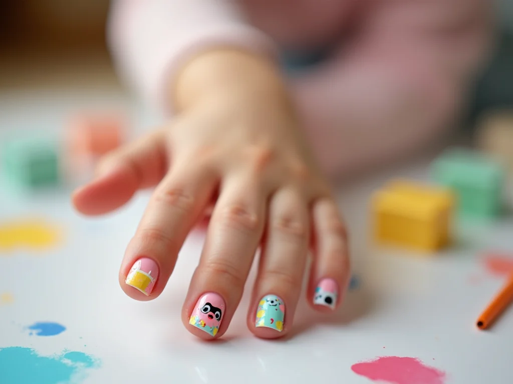 Personagens animados: diversão e cor nas ideias de nail art para crianças.