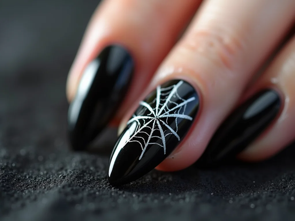 Unhas preto e branco fosco com detalhes em teia de aranha.
