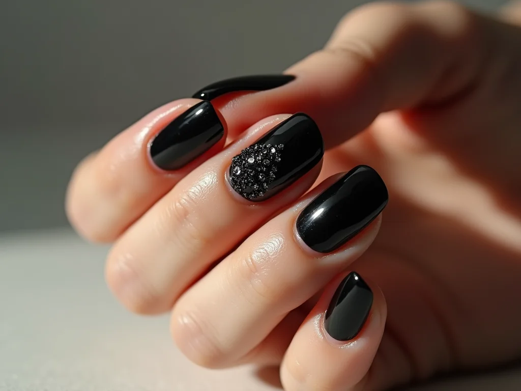 Toque de Brilho: Unhas de Gel Pretas com Glitter e Pedrarias