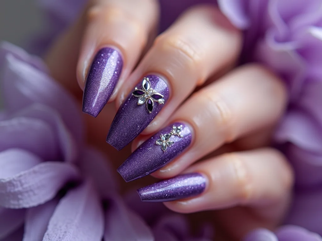 O roxo se beneficia imensamente da adição de brilho. Seja com esmaltes que contêm micropartículas cintilantes ou com o uso de glitter, o efeito é sempre impactante. Experimente um degradê de glitter roxo sobre uma base escura para um visual noturno, ou um toque sutil de brilho nas pontas para um charme extra.