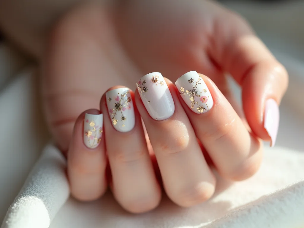 Temas de Natureza: Flores Pequenas e Folhagens DelicadasFlores miúdas, folhas leves, ramos delicados. Traz a beleza da natureza para suas unhas de um jeito suave.Pequenos detalhes, como pétalas, podem lascar. Use a técnica de “selar a ponta” com o top coat. Isso é essencial!