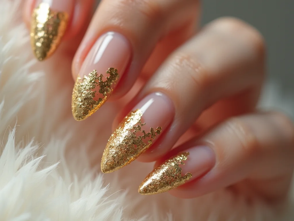 O minimalismo com folha de ouro, popularizado como “naked nails”, aposta em bases claras como nude ou rosa leitoso. Pequenos detalhes dourados aplicados estrategicamente criam um efeito de “luxo discreto”, perfeito para o dia a dia, como visto em diversas inspirações recentes.