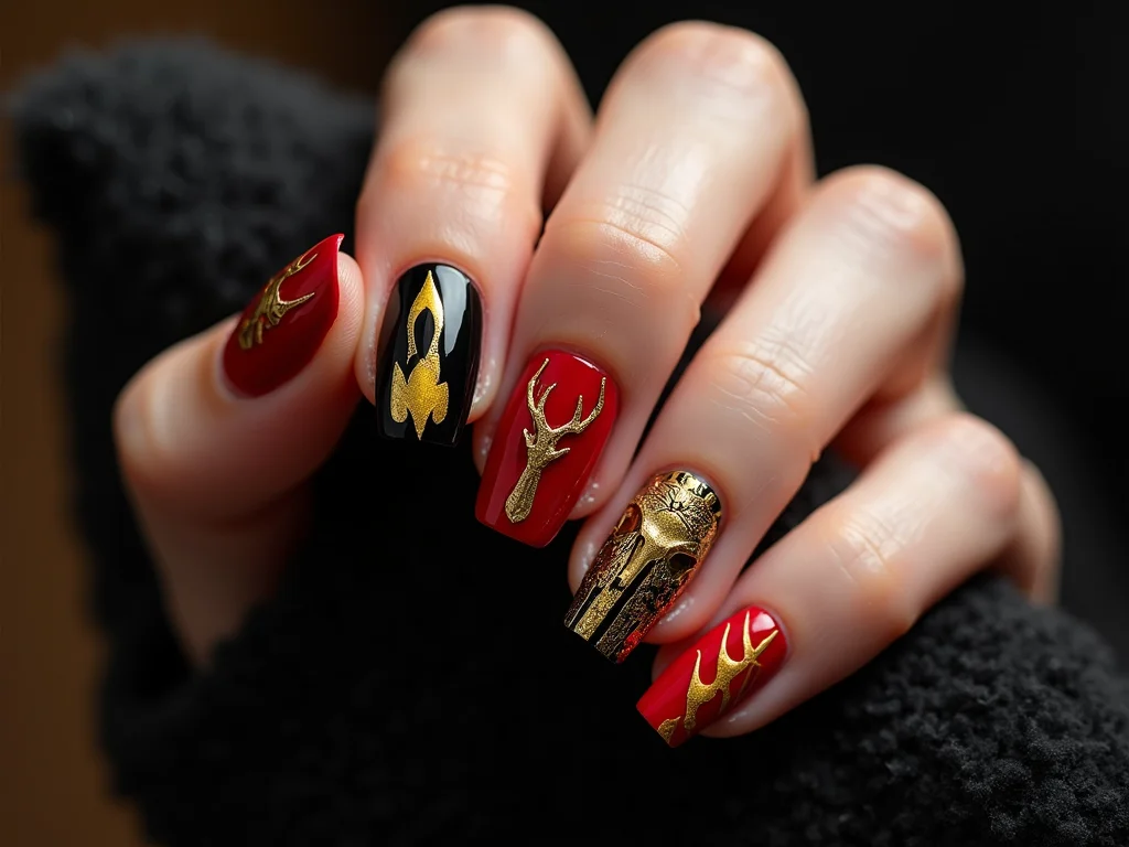 Para complementar o vermelho, aposte no amarelo ou dourado para os detalhes, como nas luvas e gola. O preto ou marrom escuro completa o visual, lembrando as calças e botas. Essas combinações trazem profundidade e autenticidade, como em uma coleção de esmaltes focada em personagens.