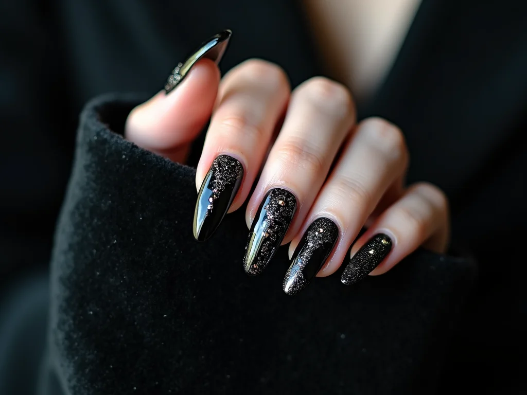 | Pedrarias e Glitter: O Glamour Sombrio Perfeito | Cristais pretos, pedras escuras, glitter furta-cor ou em tons de prata e ônix. Use-as para criar pontos de luz ou cobrir unhas inteiras para um visual impactante. | Cole as pedras com um top coat mais espesso ou cola de unha. O glitter pode ser aplicado sobre o esmalte úmido ou com um pincel seco para mais controle. Uma ou duas unhas com pedrarias já fazem um impacto. |