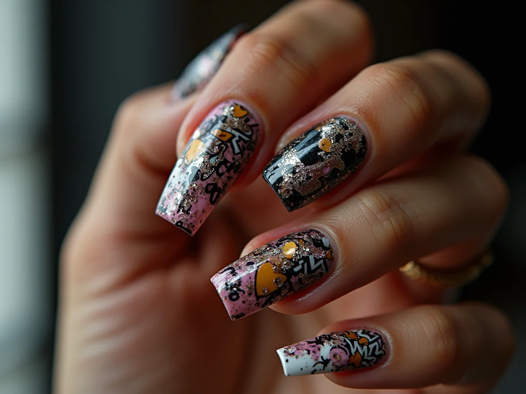 O segredo é misturar texturas e usar adesivos ou carimbos para facilitar. Você pode combinar diferentes desenhos em cada unha, criando um look único. Fica tranquilo(a), não precisa ser expert em desenho para arrasar. O estilo permite essa liberdade.