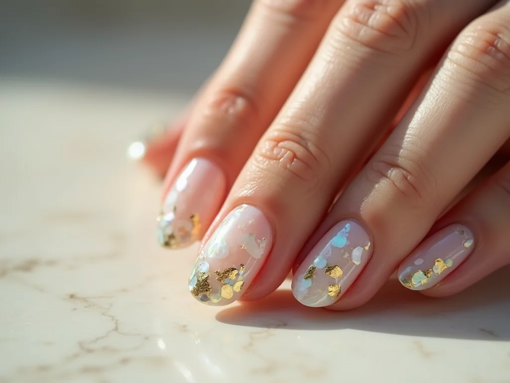 A beleza da unha decorada madrepérola está na sua capacidade única de capturar a luz. Cada fragmento reflete tons iridescentes, criando um efeito de profundidade que parece vivo.