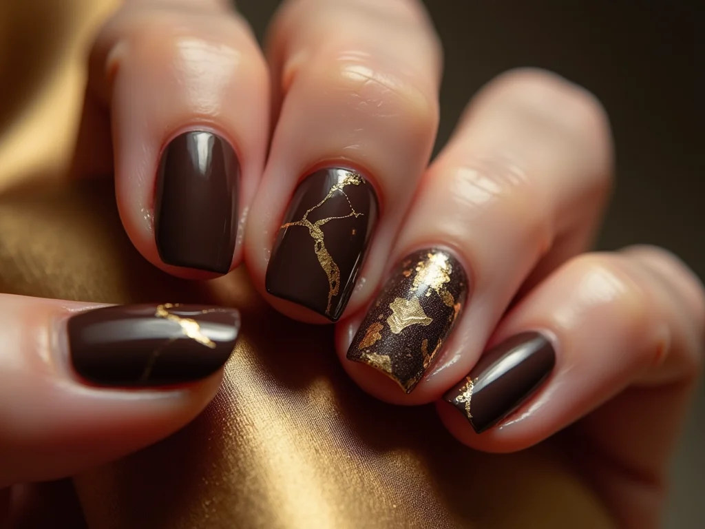 Manicure sofisticada marrom e ouro: um clássico reinventado.