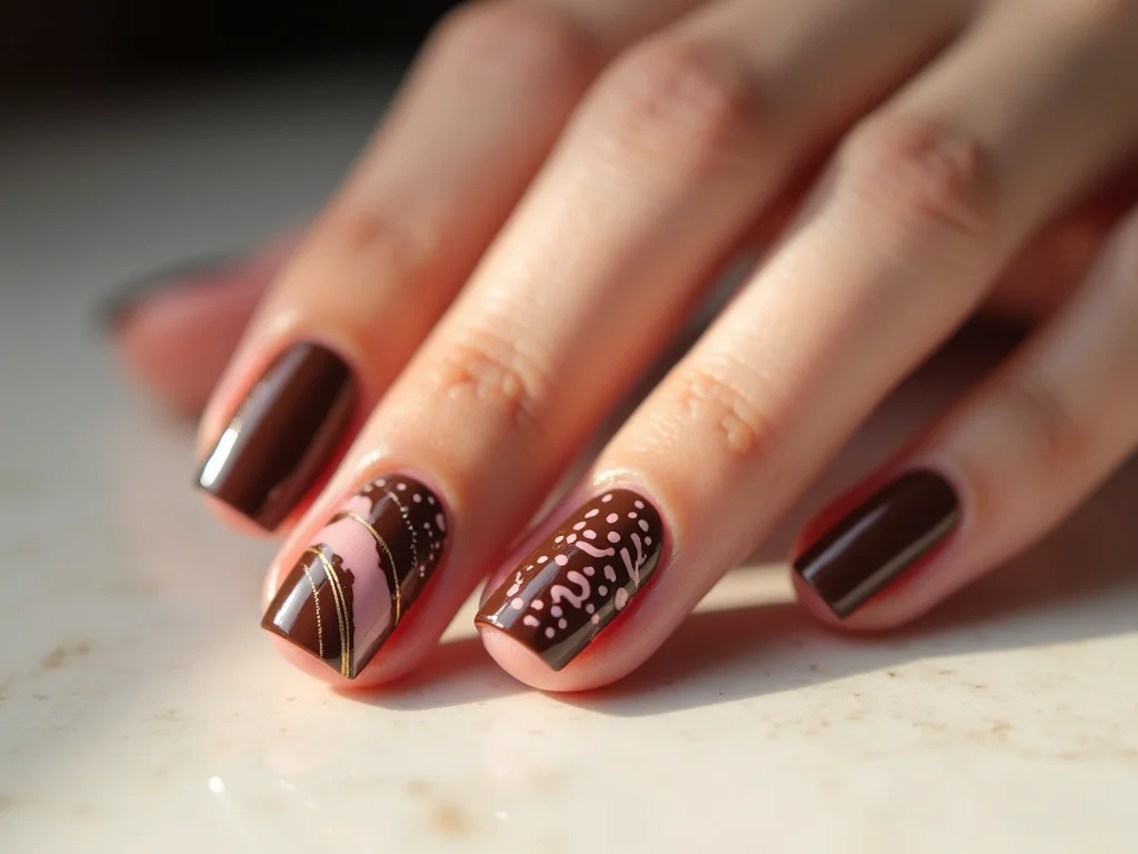 Nail art sofisticada marrom e rosa com aplicações delicadas.