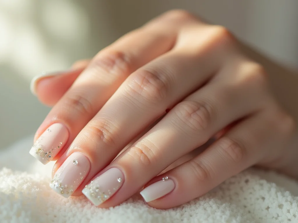 Decoração de unhas em tons de branco com glitter sutil.