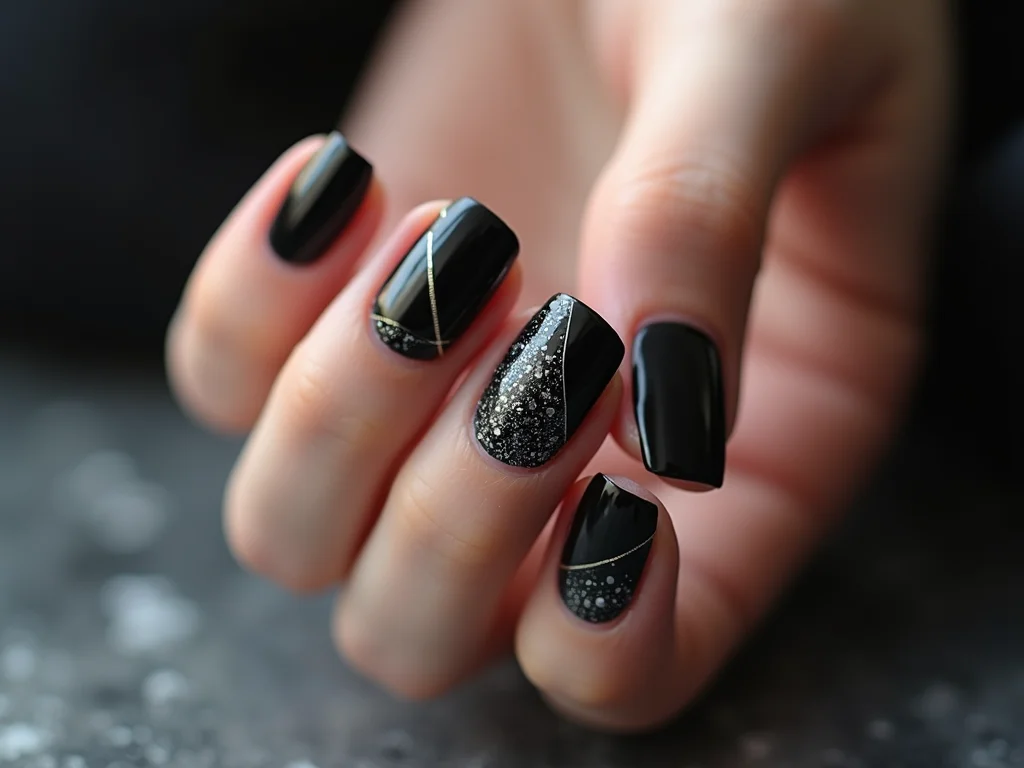 Ousadia e estilo: unhas com glitter prata e base preta em formas criativas.
