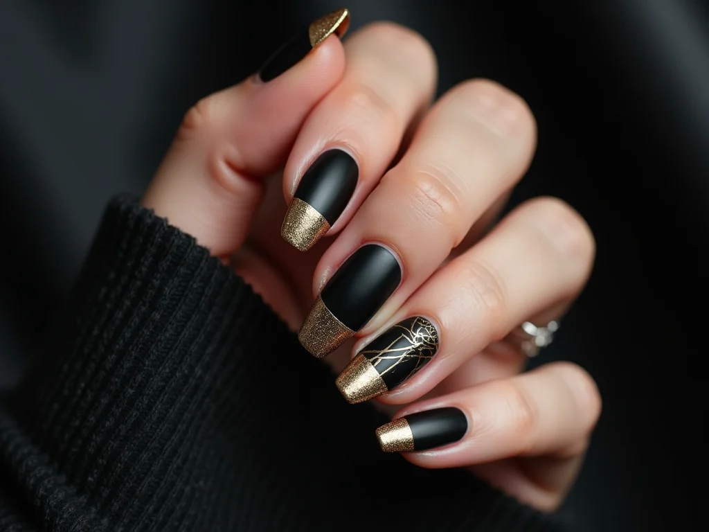 | Curta e Poderosa: O Preto com Acabamento Dourado Matte | Elegância discreta para unhas curtas. O dourado matte suaviza o brilho, mantendo a sofisticação. | Aplique o esmalte preto e finalize com um top coat matte. Use um esmalte dourado cremoso para detalhes ou um adesivo fino. |