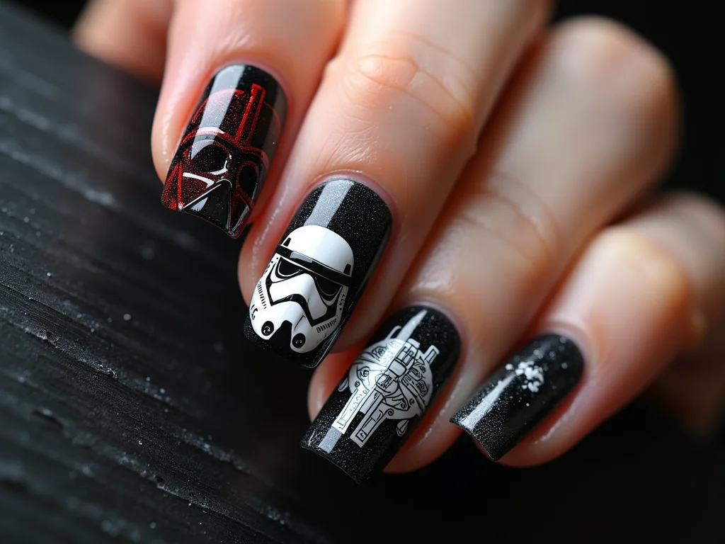 A gente pode apostar em designs que remetem ao Império ou à Rebelião. Um R2-D2 sutil em uma unha, ou a silhueta do Millennium Falcon. Outras ideias são as galáxias distantes, com aquele efeito degradê de estrelas. E que tal o capacete do Darth Vader ou do Stormtrooper? Fica super marcante, um visual que ninguém esquece.