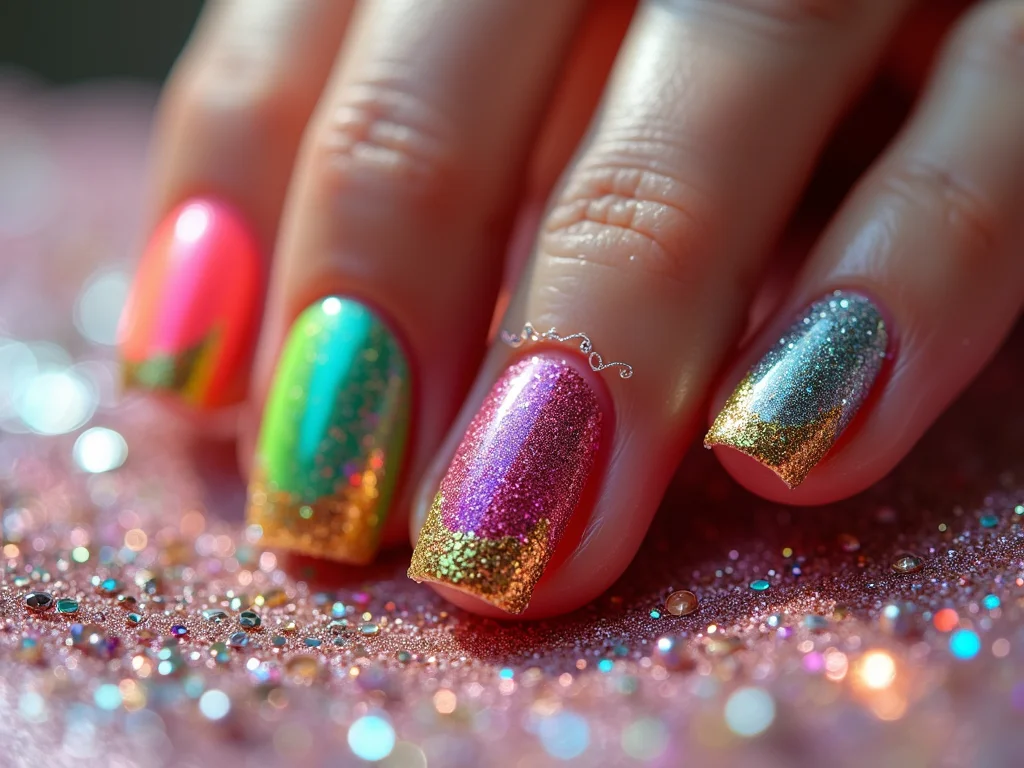Nail art vibrante para folia com glitter holográfico.