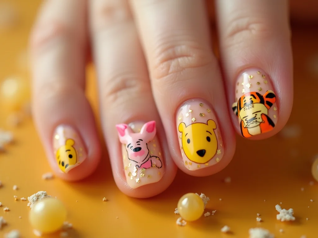 Para conseguir esse efeito, eu costumo usar esmaltes em tons pastéis ou vibrantes, dependendo do personagem. Um fundo amarelo clarinho para o Pooh, um rosa suave para o Leitão, e um laranja bem vivo para o Tigrão. Detalhes como as listras do Tigrão ou o rostinho sorridente do Pooh podem ser feitos com pincel fino ou até com adesivos. O segredo é caprichar na delicadeza.