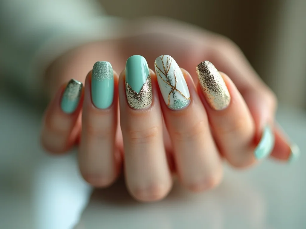 A união do verde água com o dourado, seja através de folhas de ouro ou esmalte metalizado, cria um visual de luxo instantâneo. Esse contraste é ideal para ocasiões especiais, elevando seu look a outro patamar, como você pode ver nas inspirações do TikTok.