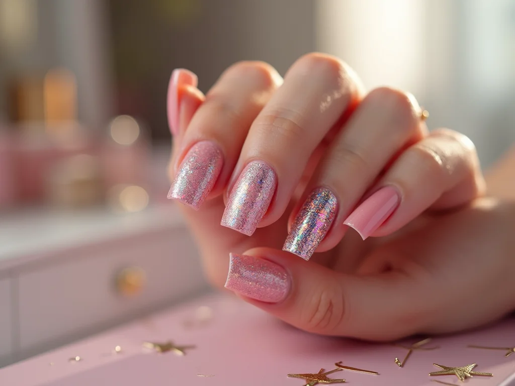 Imagina só, a delicadeza do rosa encontrando o brilho cintilante do glitter. É a combinação perfeita para quem busca um toque de glamour sem perder a feminilidade.