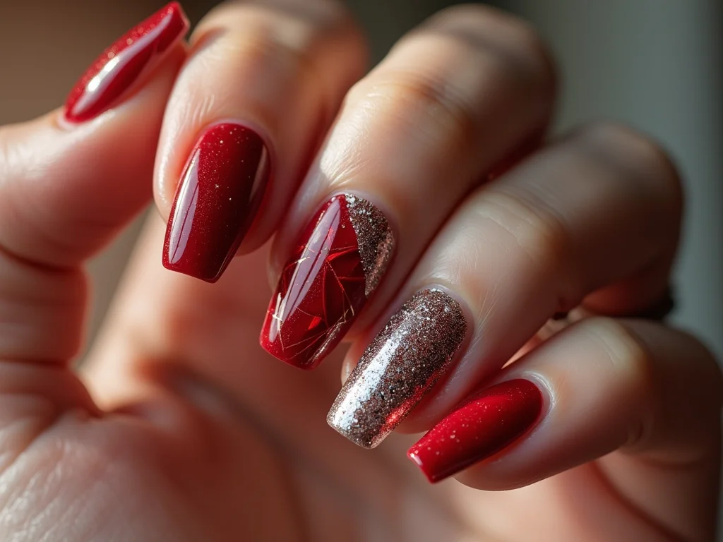 A graça desse mix é que você pode brincar com as texturas. Que tal uma unha totalmente vermelha, vibrante, e na unha ao lado usar um esmalte prata com glitter, que captura a luz? Ou quem sabe uma base vermelha com detalhes em prata, como traços finos ou pequenas pedrinhas? O metalizado do prata dá um toque especial, traz um reflexo que chama atenção.