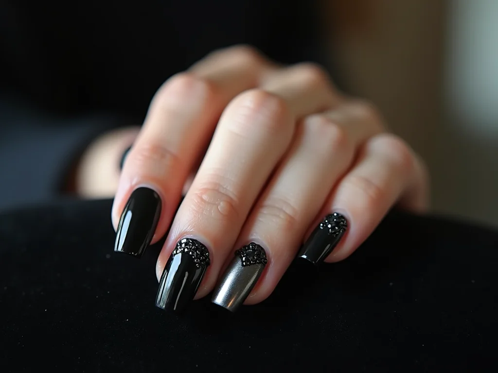 Decoração de unhas com esmalte preto e detalhes metálicos.