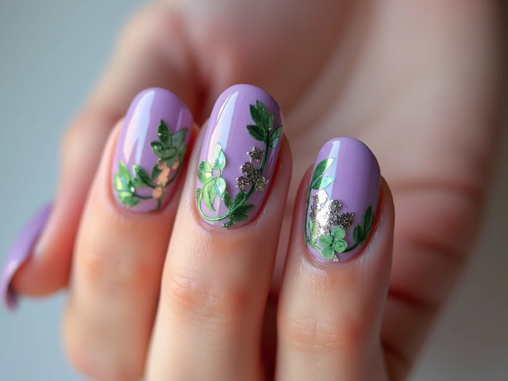 Pense nas flores em tons de lilás, que podem variar do clarinho pastel até um mais vibrante, e o verde para as folhinhas, que pode ser um musgo suave ou um verde mais vivo. Dá pra fazer flores inteiras, só detalhes, ou misturar com as folhagens em degradê. Se você gosta de algo mais discreto, um traço fino de verde em volta de uma florzinha lilás já faz toda a diferença. E se quer ousar, pode apostar em desenhos mais elaborados, criando um mini jardim em cada unha. Fica chique!