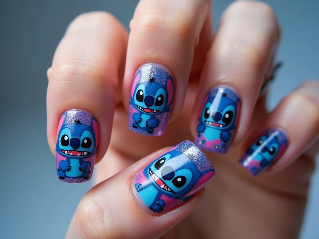 Unha Encapsulada com Glitter e Detalhes do Stitch