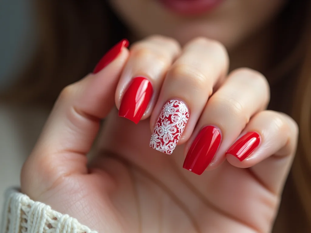 Nail art clássica vermelho e branco com brilho discreto.