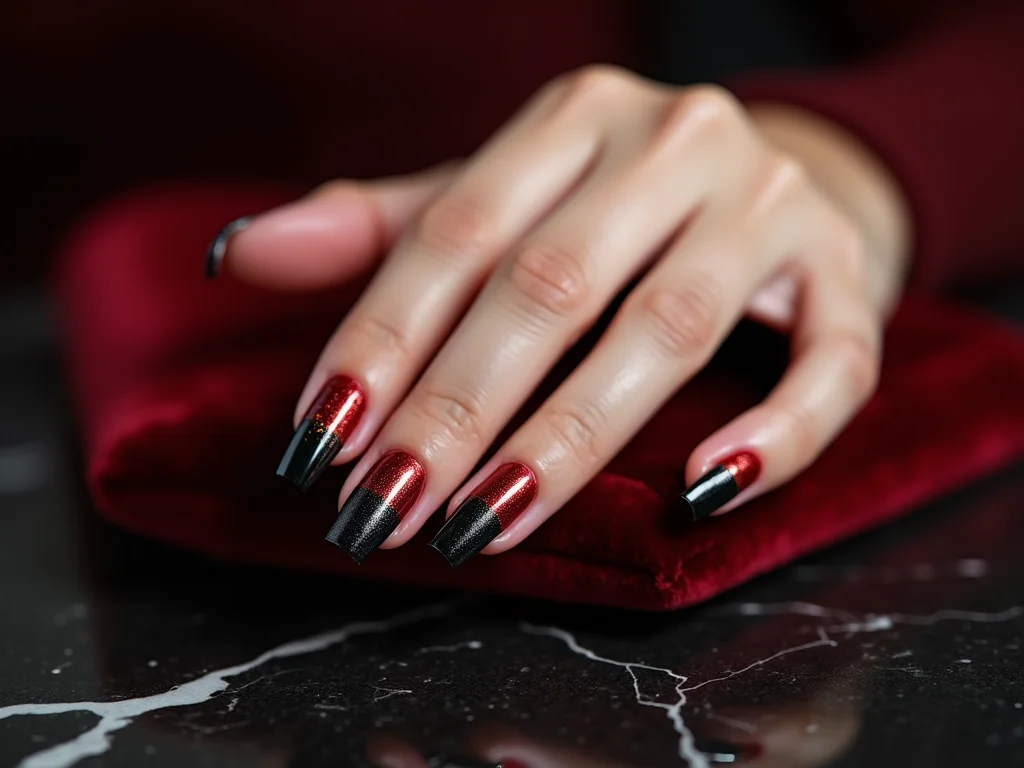 O efeito “Louboutin”, inspirado nos sapatos de sola vermelha, traz um toque de mistério com a unha preta por cima e a parte de baixo vermelha. Para um realce noturno, o glitter vermelho sobre o preto adiciona profundidade e um brilho espetacular, perfeito para eventos especiais.